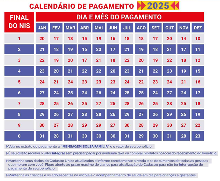 A organização do pagamento do programa segue um padrão já conhecido e é feita de acordo com o final do Número de Identificação Social (NIS) de cada beneficiário. O objetivo é distribuir os repasses ao longo dos dez últimos dias úteis de cada mês.